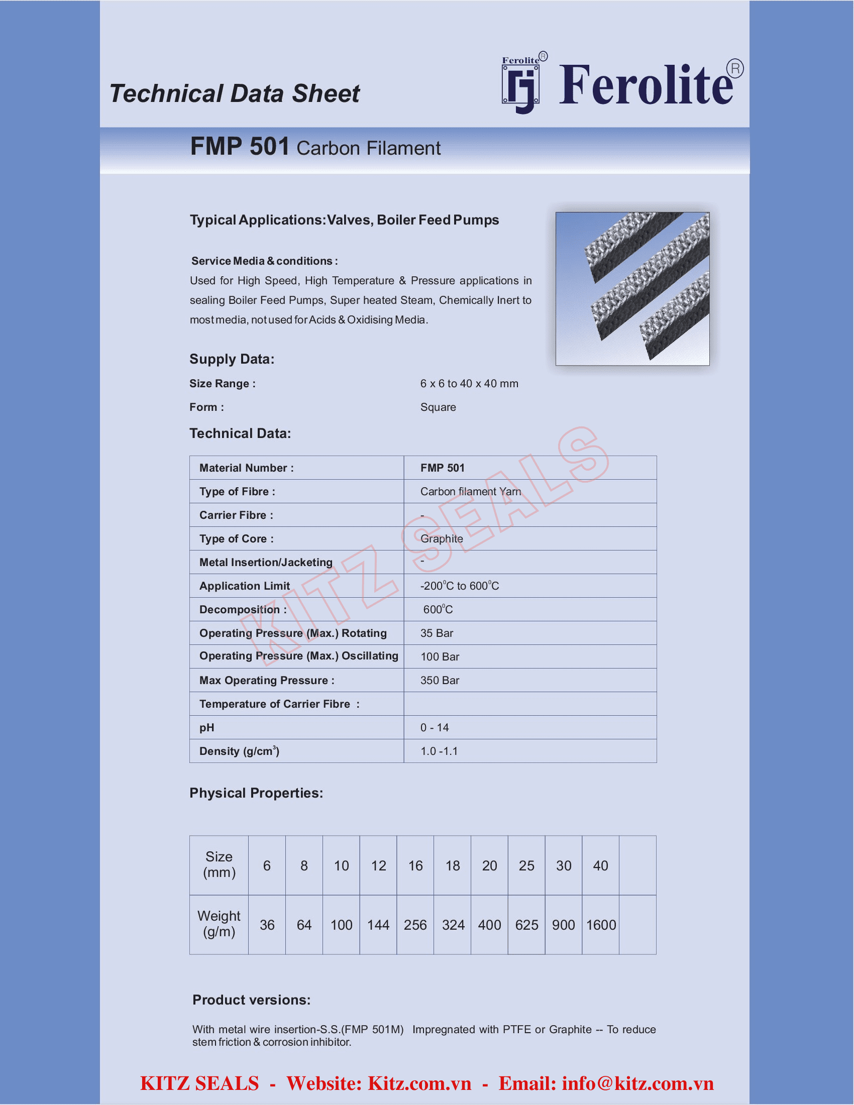 - Dây tết chèn carbon Ferolite 501 là dòng sản phẩm được làm từ sợi carbon chất lượng cao có cơ lý hóa tính rất tốt đáp ứng ở môi trường nhiệt độ cao, áp suất cao.
