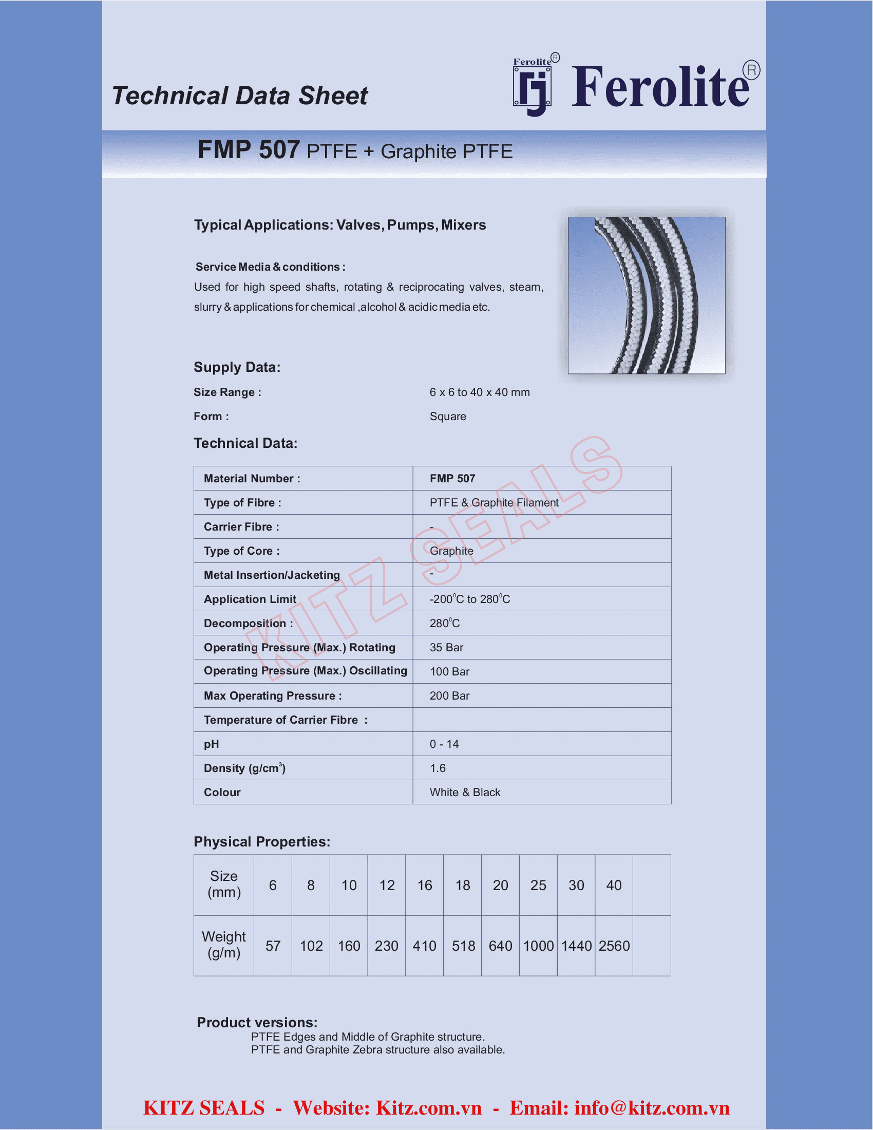 - Dây tết chèn FMP-507 là dòng sản phẩm cái tiến của FMP-404 được gia cố thêm gPTFE để tăng cơ tính và chịu mài mòn tốt hơn.