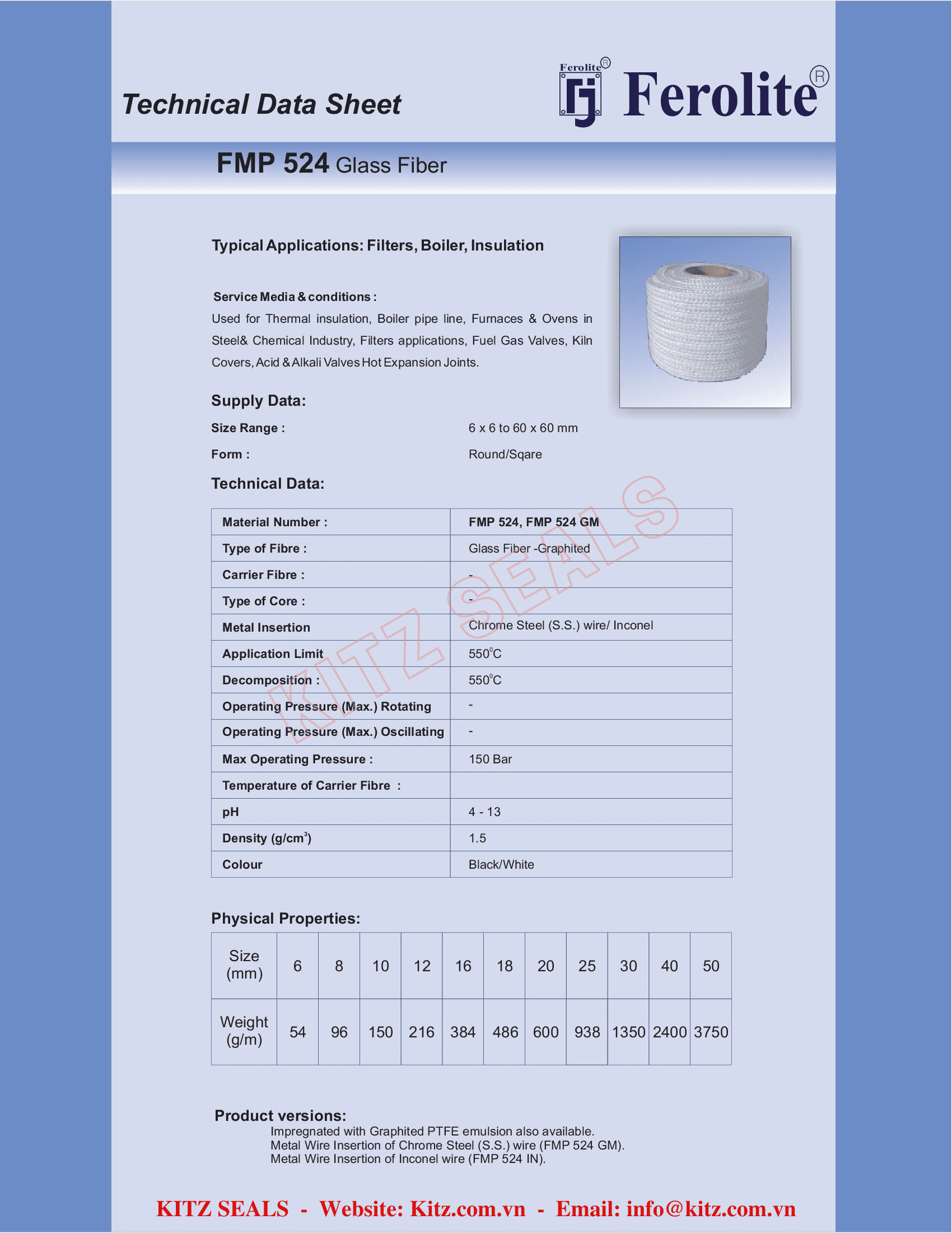 - Dây thủy tinh FMP 524 được hãng ferolite ấn độ sản xuất trên công nghệ cao đáp ứng được các yêu cầu khắt khe cho việc làm kín ở nhiệt độ cao của các ngành nhiệt điện, xi măng, hóa chất...