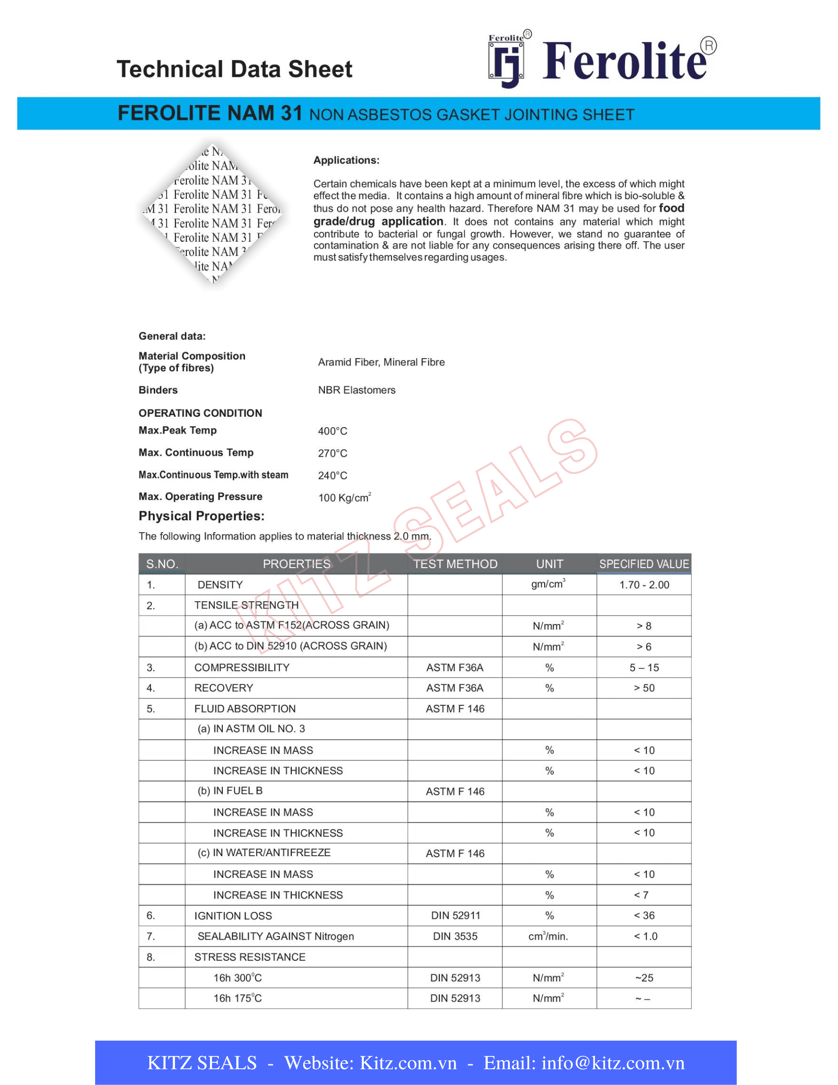 Thông Số Kỹ Thuật Tấm Gioăng NAM 31 FEROLITE