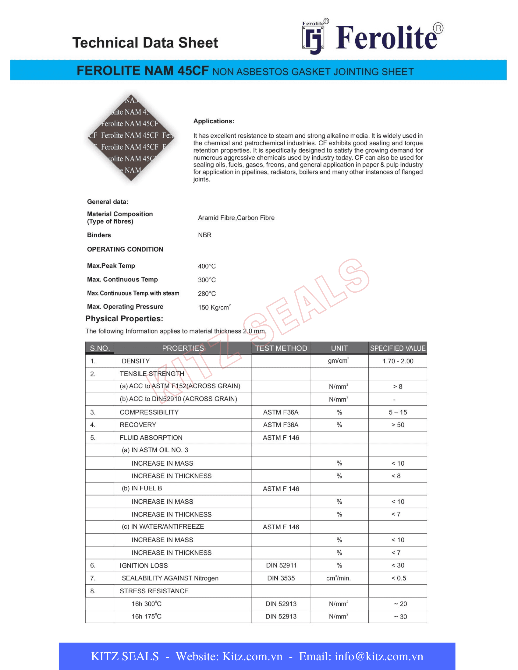 - Tấm đệm làm kín NAM 45CF được làm từ sợi Aramid Fiber và sợi Carbonl Fibre và chất kết dính độn là cao su NBR thông qua quá trình ép cán nóng thành dạng tấm có độ dày khách nhau tùy theo mục đích sử dụng.