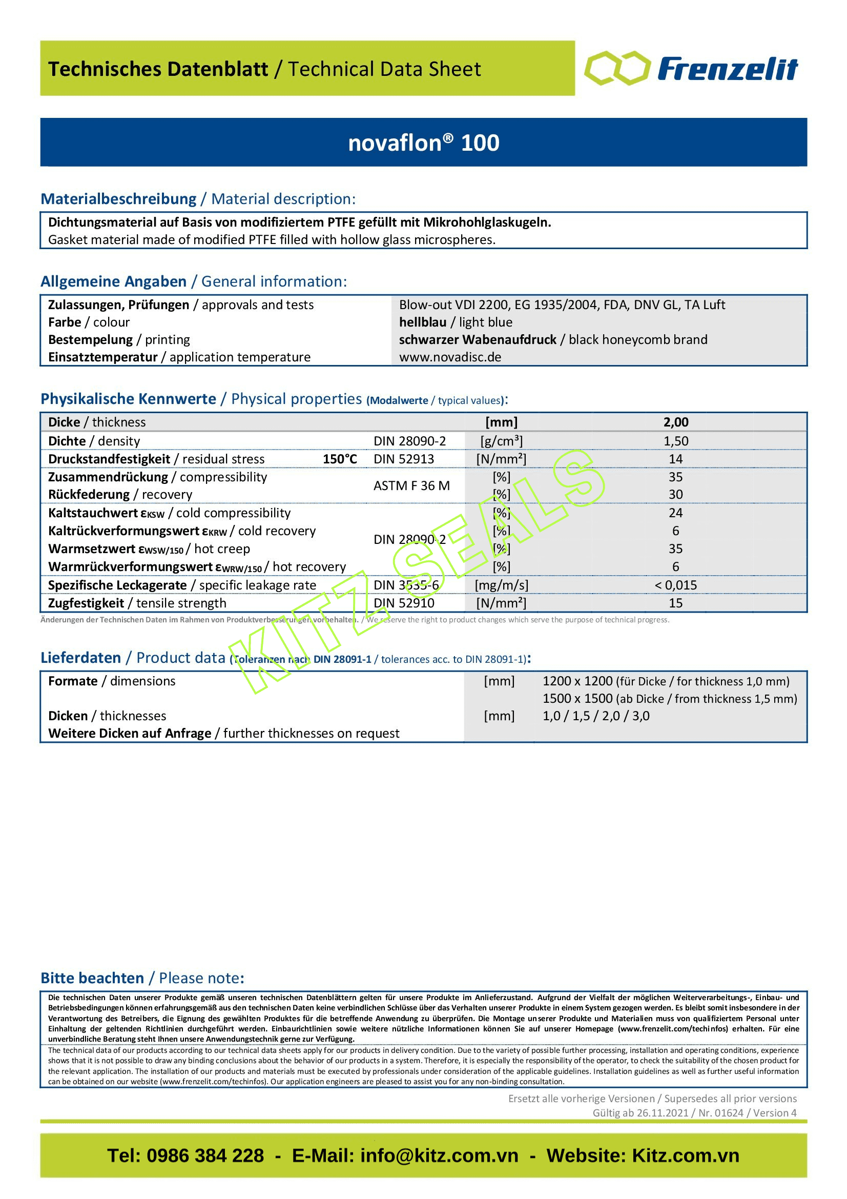 Thông Số Kỹ Thuật Gioăng NOVAFLON 100