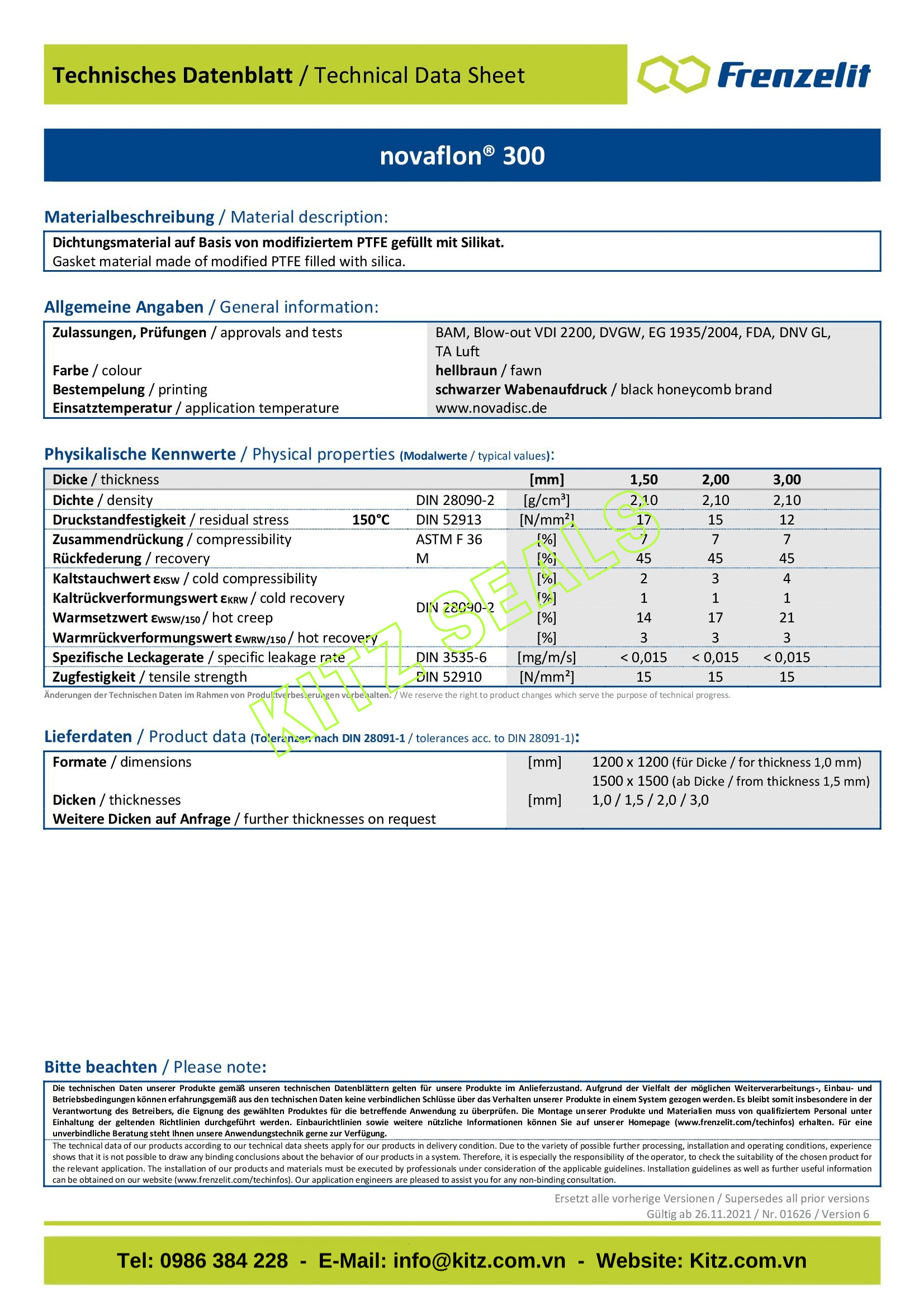 - Gioăng không amiăng NOVAFLON 300 được Kitz seals nhập khẩu và gia công cung cấp cho sửa chữa thay thế và các dự án lắp mới yêu cầu chịu hóa chất và nhiệt độ tốt.