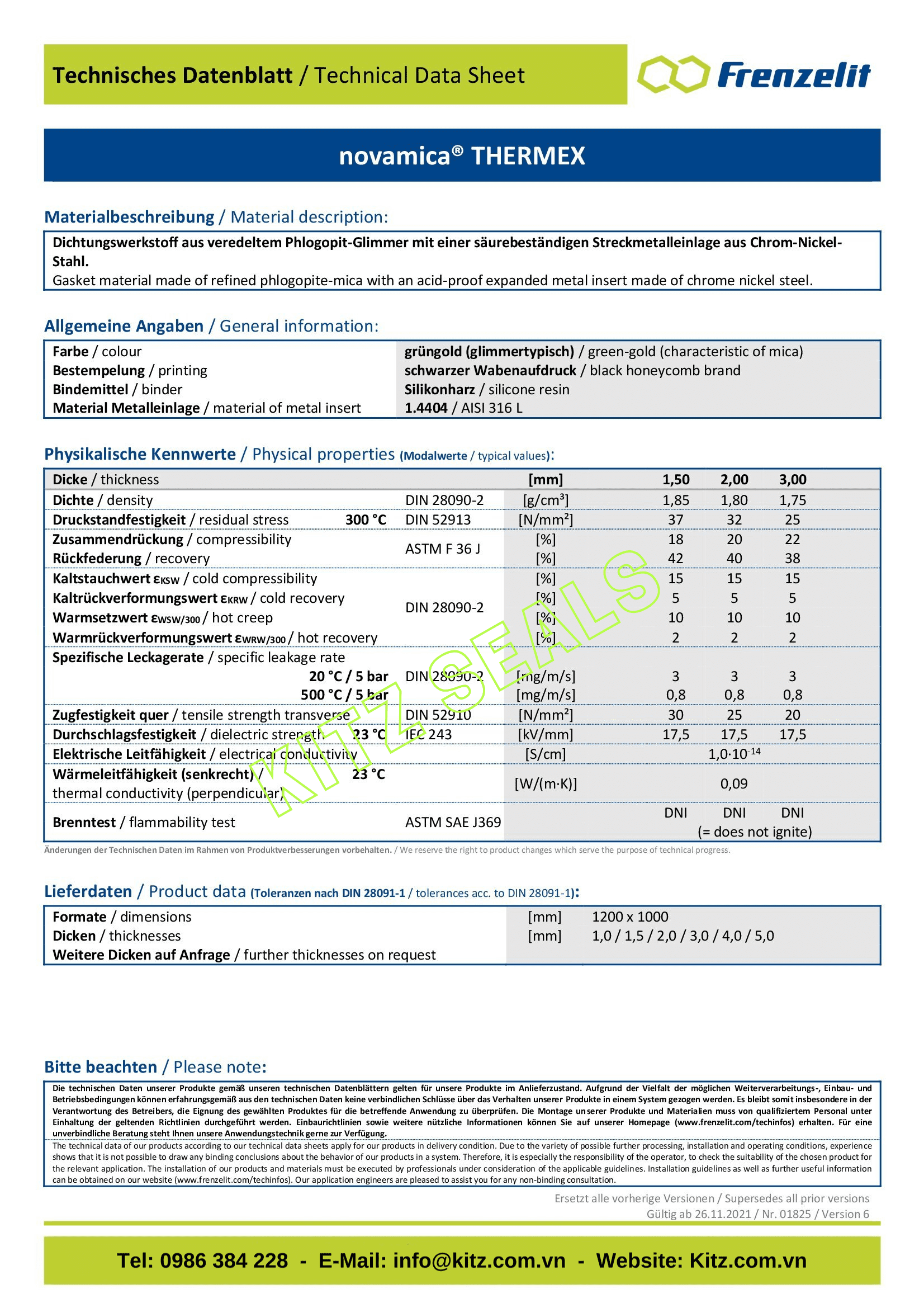 - Gioăng không amiăng NOVAMICA THERMEX được Kitz seals nhập khẩu và gia công cung cấp cho sửa chữa thay thế và các dự án lắp mới yêu cầu chịu hóa chất và nhiệt độ tốt.