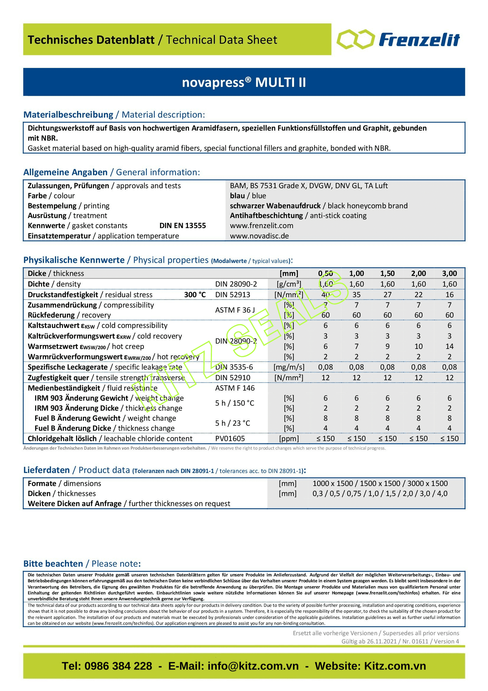 - Gioăng không amiăng NOVAPRESS MULTI II được Kitz seals nhập khẩu và gia công cung cấp cho sửa chữa thay thế và các dự án lắp mới yêu cầu chịu hóa chất và nhiệt độ tốt.