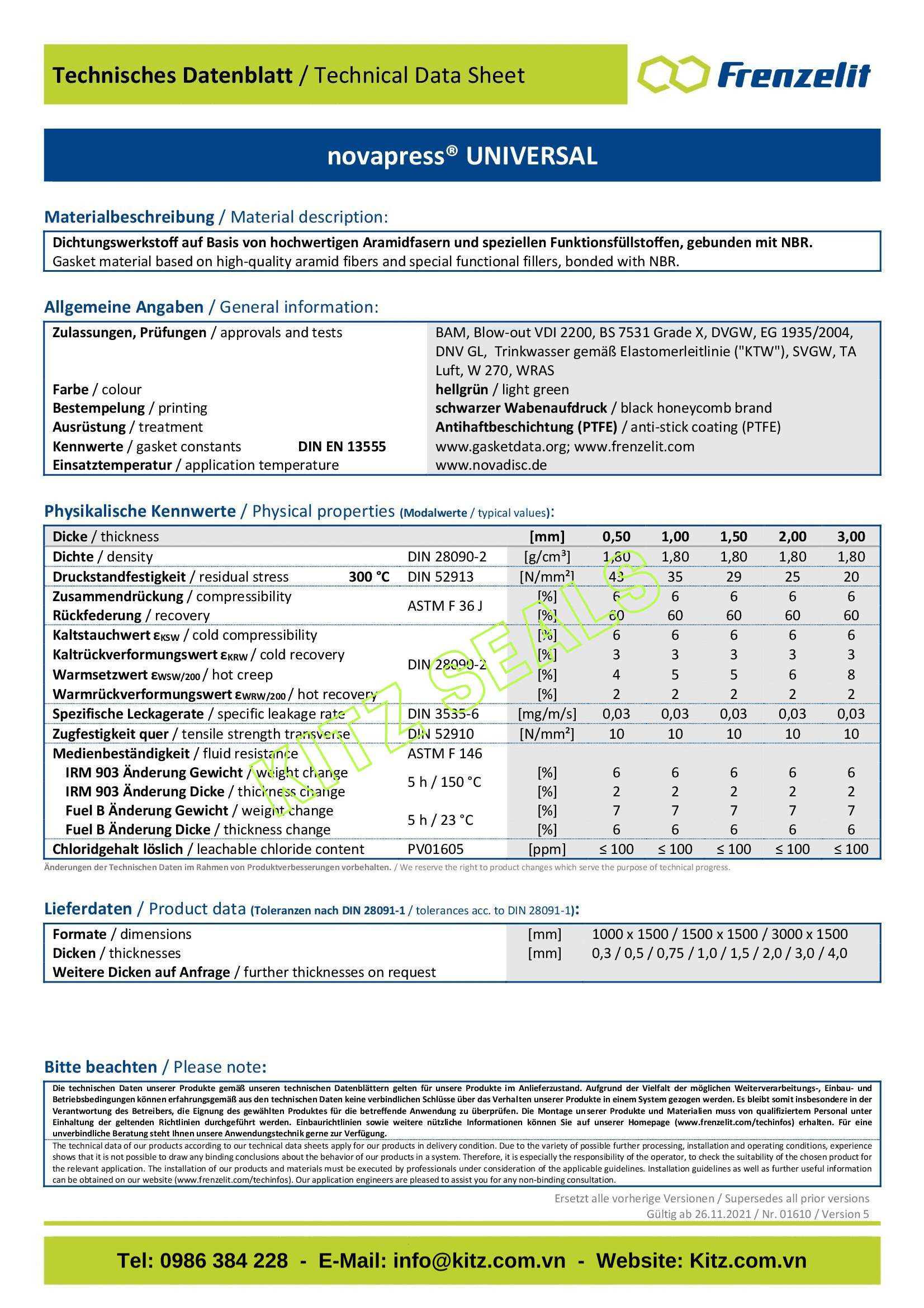 Gioăng không amiăng NOVAPRESS UNIVERSAL được Kitz seals nhập khẩu và gia công cung cấp cho sửa chữa thay thế và các dự án lắp mới yêu cầu chịu xăng dầu và nhiệt độ tốt.