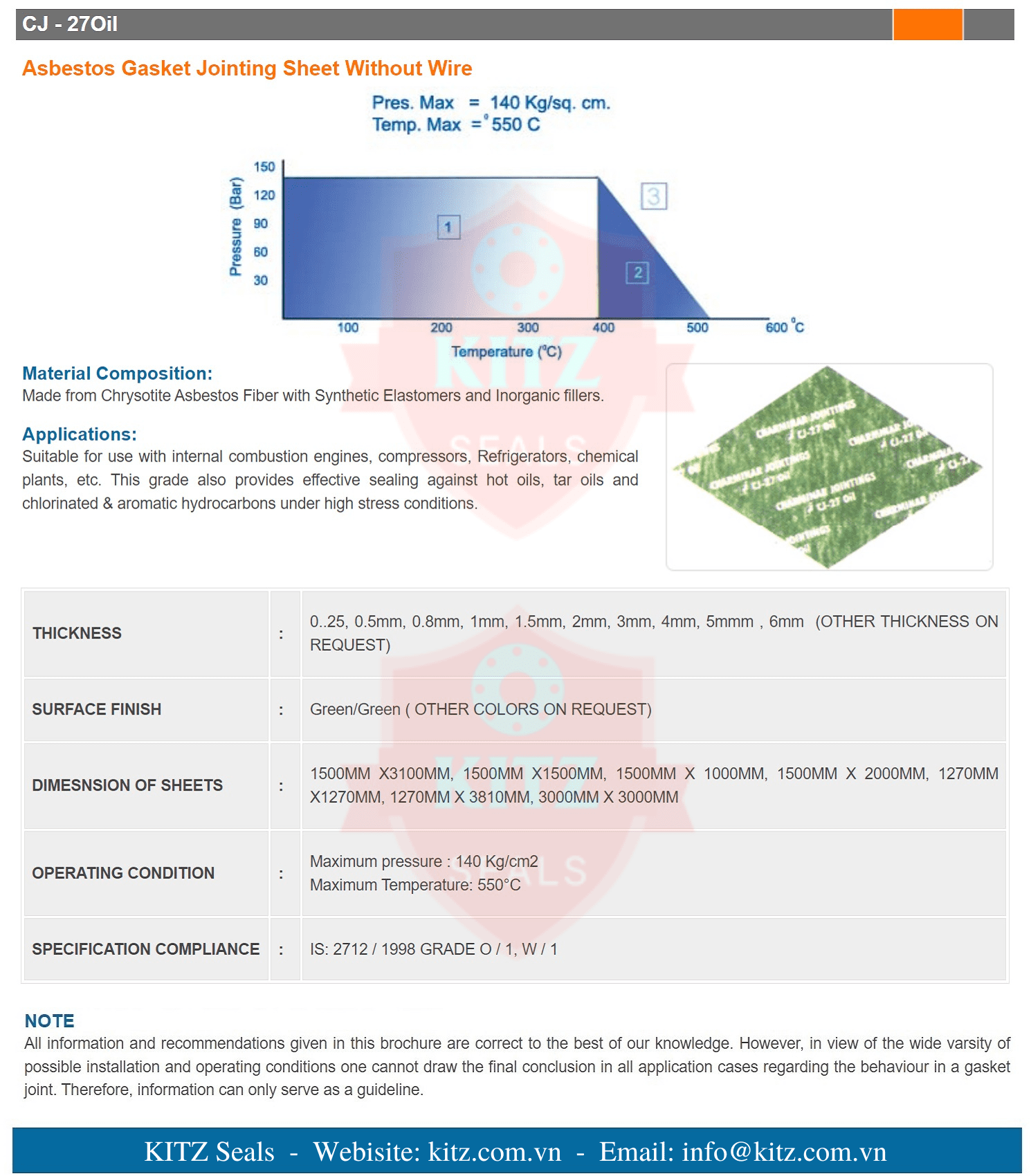 - Vật liệu cấu thành: Sợi Chrysotite Asbestos Fiber with Synthetic Elastomers and Inorganic fillers.