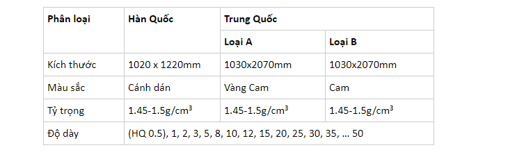 Độ dày: 1, 2, 3, 5, 8, 10, 12, 15, 20, 25, 30, 35, … 50 (mm) (TQ)